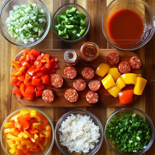 - Slice 1 pound smoked sausage into thin rounds. Dice 1 small onion, red and green bell peppers, and mince 3 garlic cloves for easy cooking.