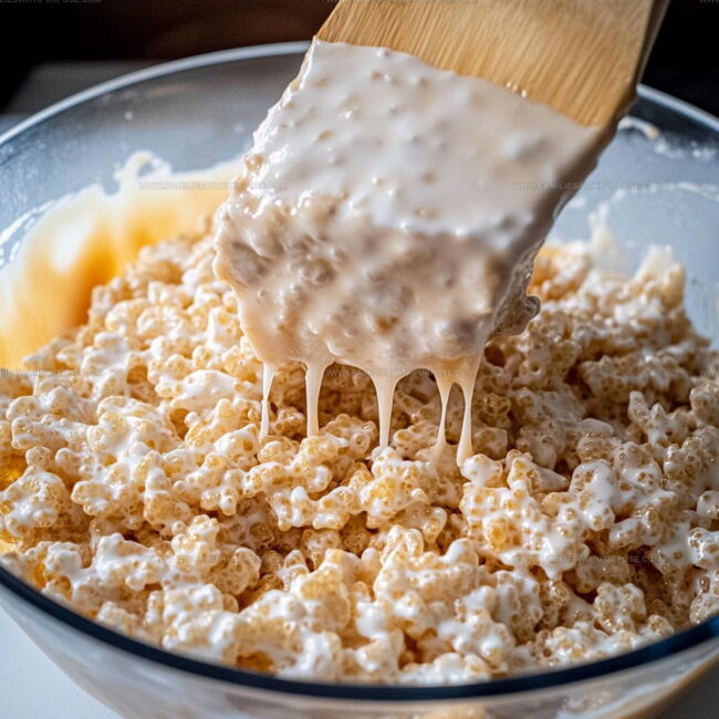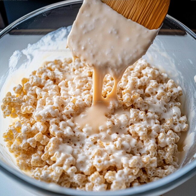 - Gently introduce 6 cups Rice Krispies cereal into the warm mixture, folding carefully to ensure each crisp piece gets completely coated with the sweet, buttery sauce.