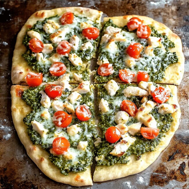 Fresh Chicken Pesto Flatbread comes together in minutes with store-bought dough and zesty homemade pesto. Layering juicy grilled chicken, aromatic herbs, and melted cheese creates a satisfying weeknight dinner your family will devour.
