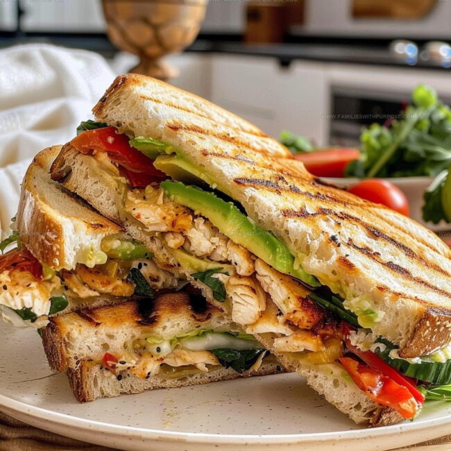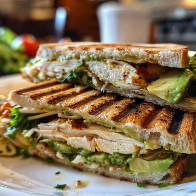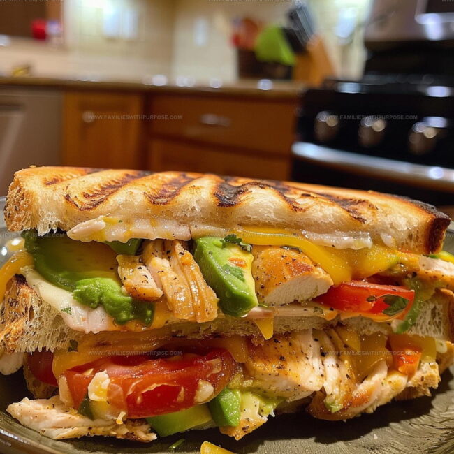 Grilled Chicken and Avocado Panini delivers a perfect lunch sandwich that brings together creamy avocado and tender chicken between crispy, golden bread slices. Melted cheese and zesty herbs make this quick meal a delicious midday treat your taste buds will absolutely adore.