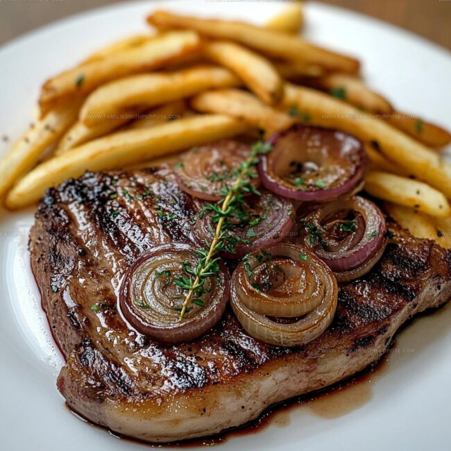 Transfer the steaks to plates, topping them with those delicious caramelized onions. Serve with crispy french fries on the side.