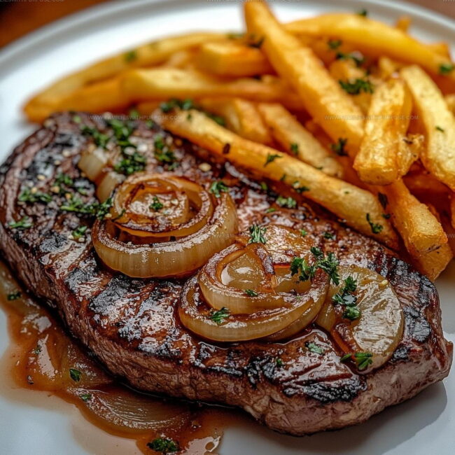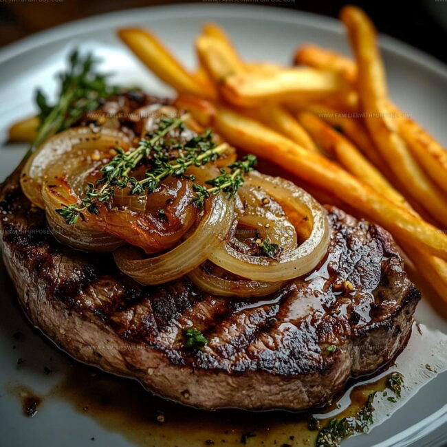 Sizzling ribeye steak with French Onions brings rich, savory comfort straight from your kitchen to the dinner table. Tender beef caramelized with sweet onions creates a classic French-inspired meal that satisfies your deepest hunger cravings.