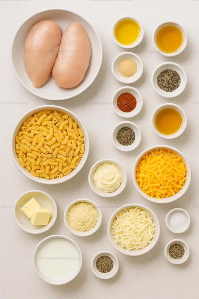 Main Protein:Chicken Seasonings:Chicken Glaze:Pasta Base:Cheese Sauce Components:Cheese Blend:Final Seasoning:Tools Supporting Gooey Mac and Tender Chicken
