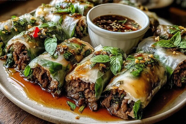 Arrange your completed Thai basil beef rolls on a platter. Serve immediately with the dipping sauce on the side. Each bite brings a burst of fresh herbs, tender beef, and crisp vegetables.