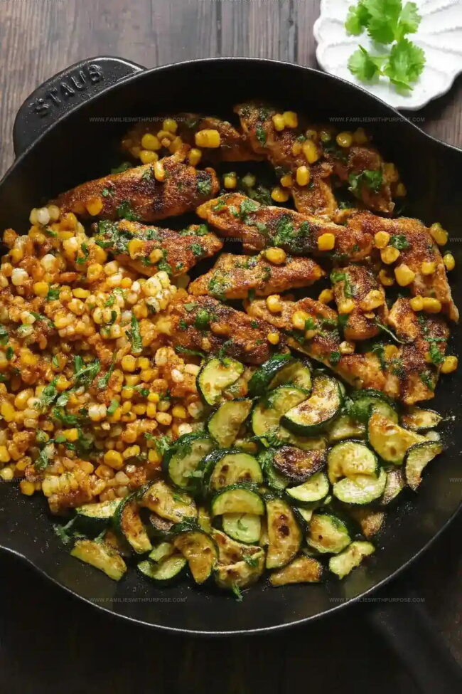 - Return zucchini and add 1.5 cups corn kernels to the skillet with chicken.