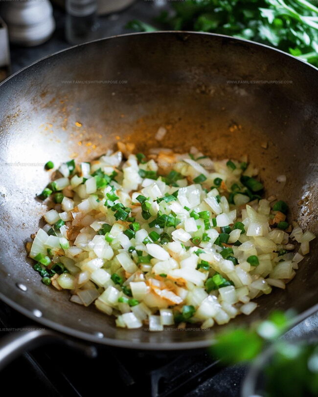 - Heat 1 tablespoon vegetable oil in a wok at medium-high heat. Sauté diced onion for 2-3 minutes until translucent.