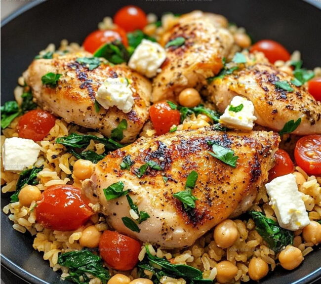 Fold half of the feta mixture into the rice skillet. Slice the cooked chicken and nestle the pieces into the rice. Sprinkle the remaining feta mixture on top. Garnish with fresh oregano if you have some. Add a pinch of salt and pepper to taste before serving hot.