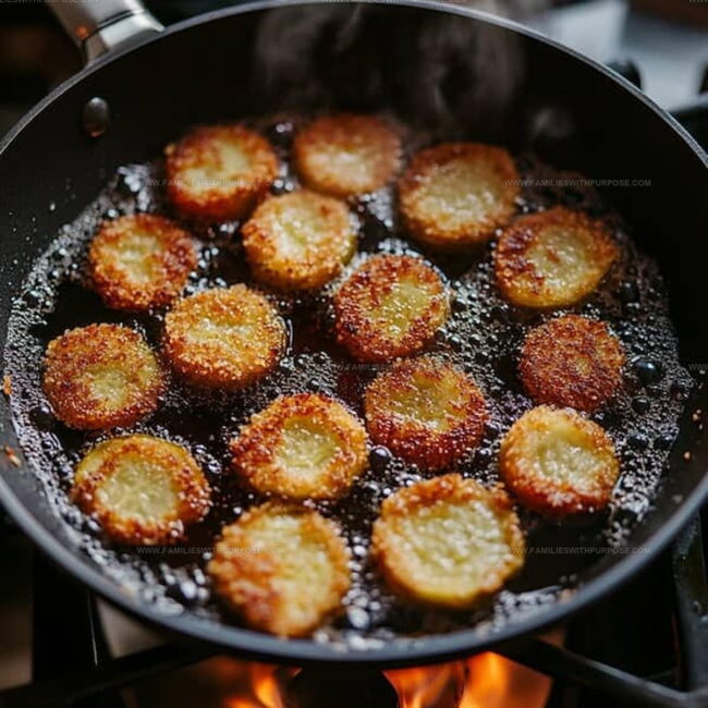 Pour vegetable oil into a skillet, filling it about 1 inch deep. Heat the oil to exactly 350°F. If you don’t have a thermometer, drop a tiny piece of bread in the oil – it should sizzle instantly when the temperature is right.