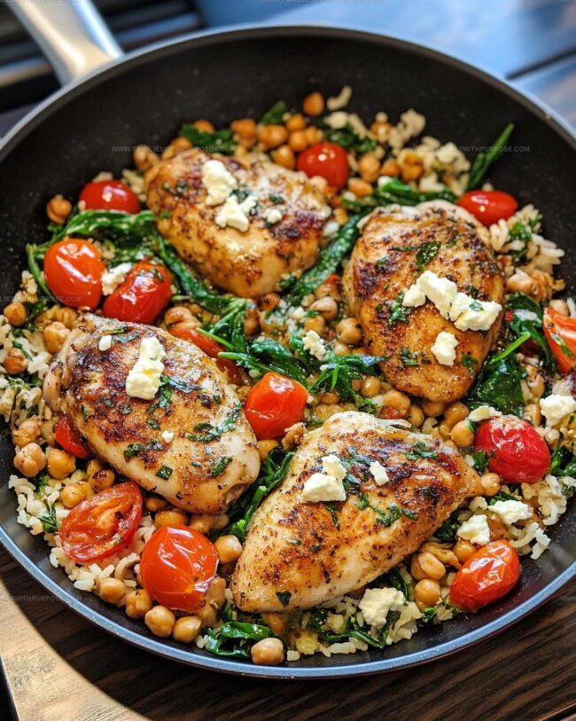 Mix half the feta mixture into the rice skillet. Slice the cooked chicken and nestle it into the rice. Reheat everything on medium for 2 minutes. Top with the remaining feta mixture and sprinkle some fresh oregano if you’d like. Add a pinch of salt and black pepper to bring out the final flavors.