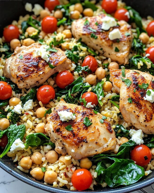 Fold half the feta mixture into the rice skillet. Slice the cooked chicken and nestle it into the rice. Sprinkle the remaining feta mixture on top. Garnish with fresh oregano if you’d like. Give a final taste and add salt and pepper as needed.