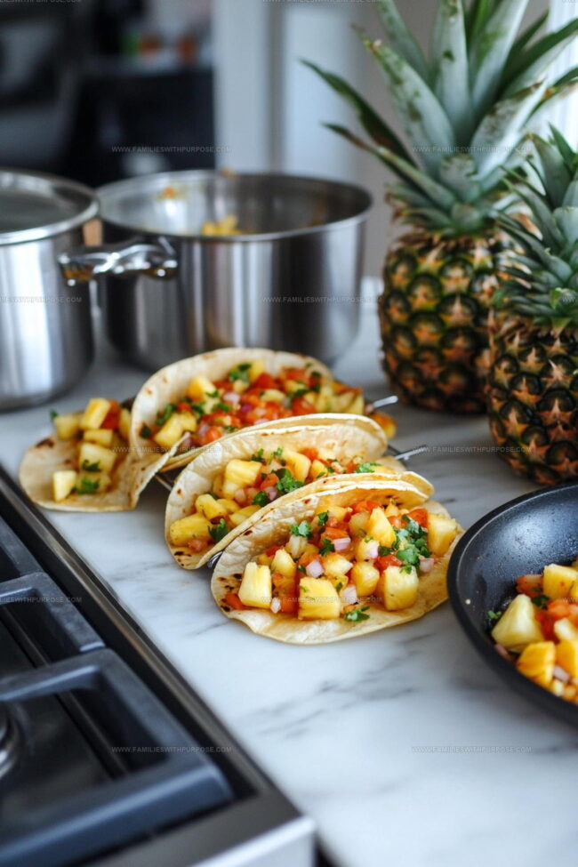 Generously spoon the cold pineapple salsa over each taco. Serve immediately while everything is fresh and warm.