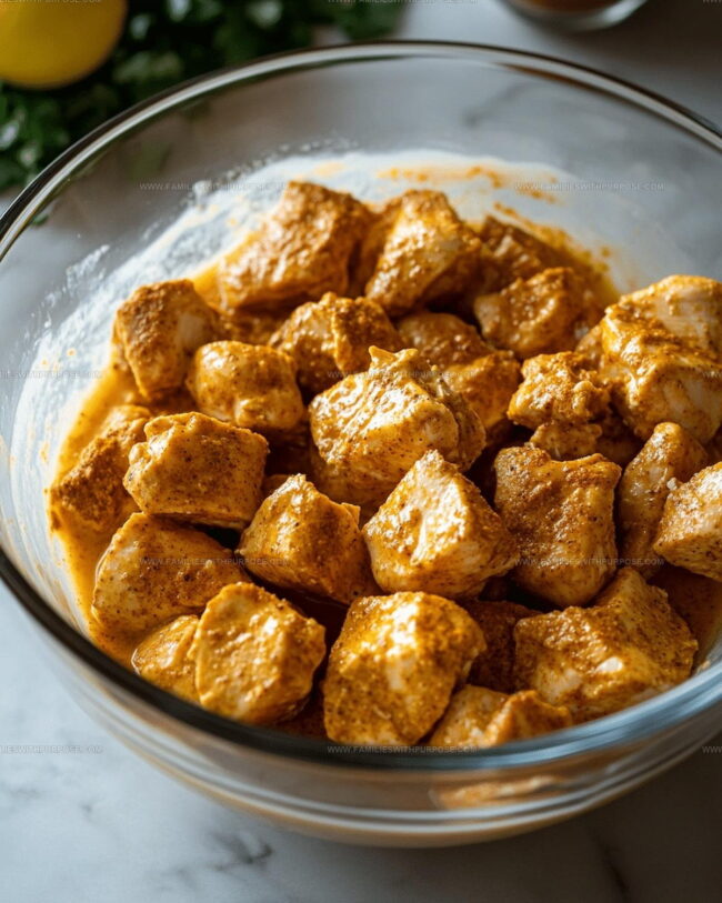- Cut 2 chicken breasts into bite-sized chunks and thoroughly coat them with the marinade. Refrigerate for a minimum of 1 hour to let flavors penetrate deeply.
