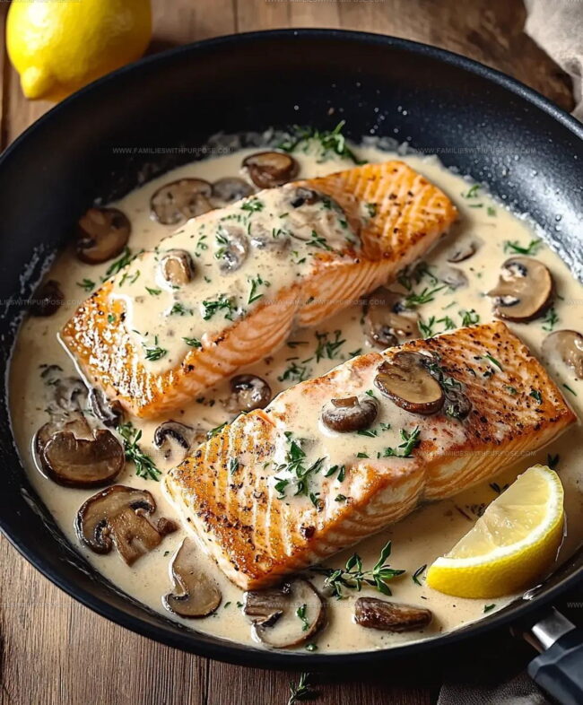 Sprinkle 1 teaspoon fresh thyme into the sauce and stir gently to spread the herbs around. Carefully return the salmon fillets to the skillet, spooning the creamy mushroom sauce over the top.