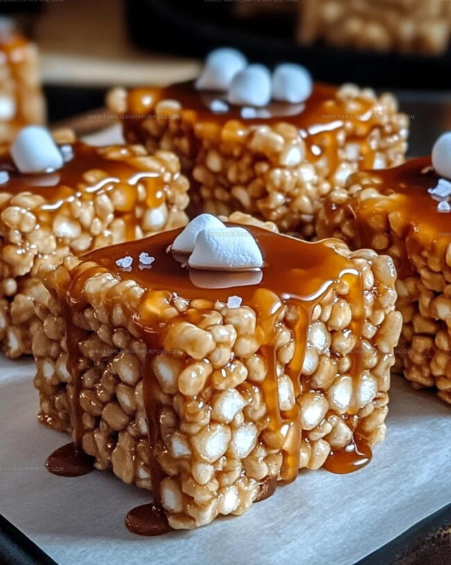 Salted Caramel Rice Krispie Treats bring childhood nostalgia right to your kitchen with a grown-up twist. Melted marshmallows, crispy rice cereal, and a drizzle of caramel make these treats a perfect sweet-salty snack that everyone will devour.