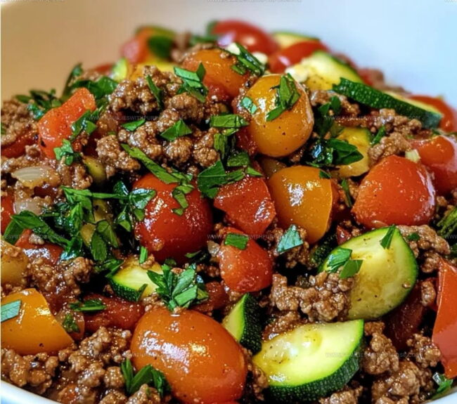- Toss 1 cup sliced bell peppers, 1 cup sliced zucchini, and 1 cup halved cherry tomatoes into the skillet, mixing thoroughly with the meat.