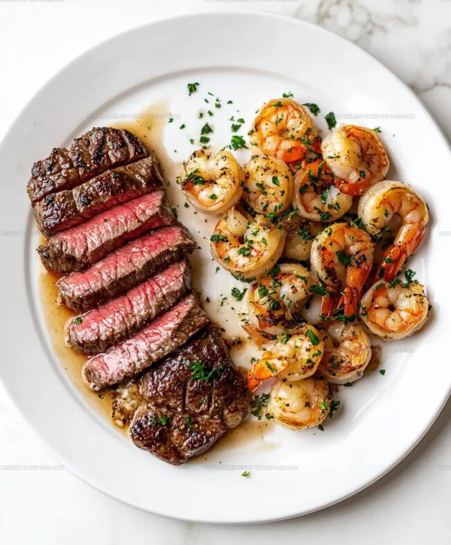 - Slice rested steaks against the grain into ½-inch thick pieces. Arrange steak slices and shrimp on serving plates. Drizzle generously with warm garlic butter sauce and garnish with additional chopped parsley.