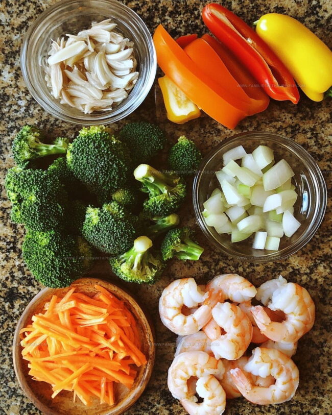 Gather everything you need before heating up the pan. Wash and chop all your veggies into bite-sized pieces. Make sure your shrimp are cleaned and ready to go.
