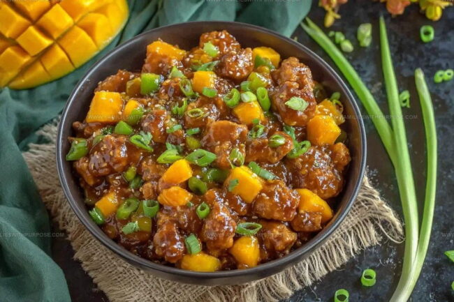 - Fold in crispy chicken pieces and 1 cup diced mango, gently coating with sauce.