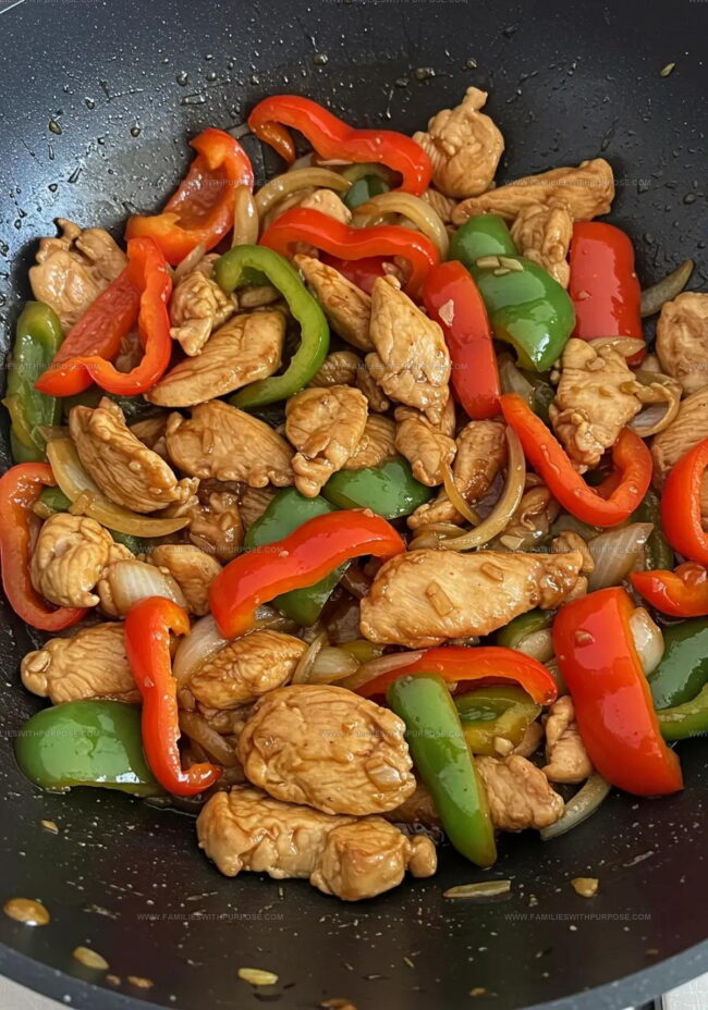 Return the chicken to the skillet and gently mix with the vegetables for 2 more minutes. This helps reheat everything and blend the flavors. Plate immediately while everything stays hot, letting that pepper-packed sauce coat each bite.