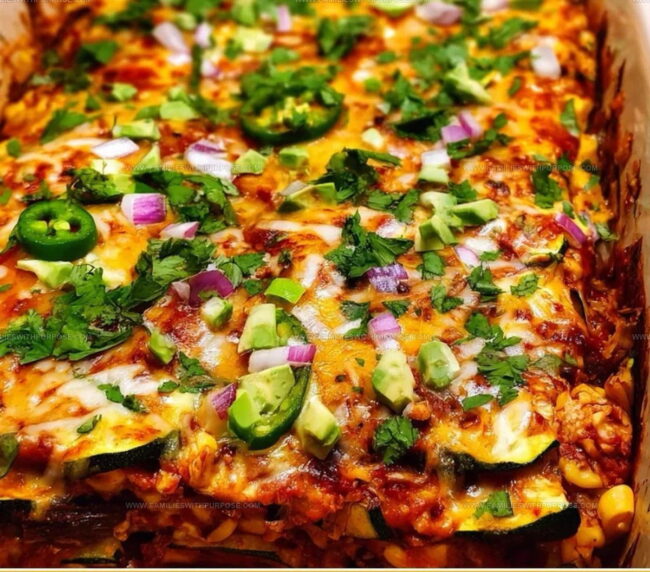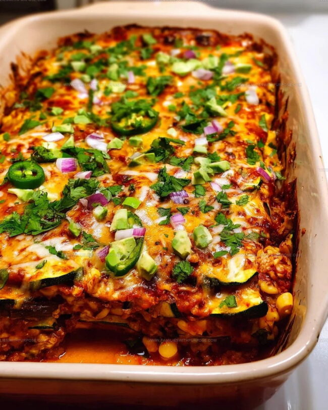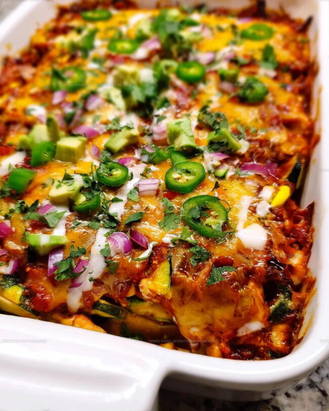 Zucchini Enchilada Casserole layers tender vegetables with melty cheese and bold spices for comforting flavor. It’s hearty, satisfying, and perfect for a cozy dinner.